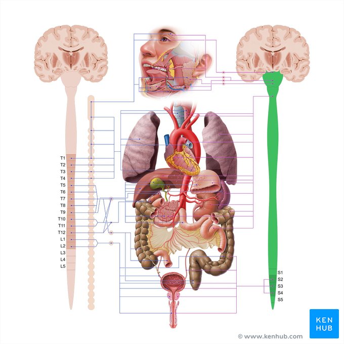 Nekklachten zijn een veel voorkomende klacht waarvoor mensen een osteopaat bezoeken. Vaak gaat dit gepaard met andere klachten zoals hoofdpijn en schouderpijn, maar ook de invloed op de organen kan niet worden onderschat. Via de parasympaticus (zie afbeelding, in het groen) worden bijna alle inwendige organen aangestuurd. Door de organen te behandelen kan dus een nekprobleem worden opgelost en vice versa.